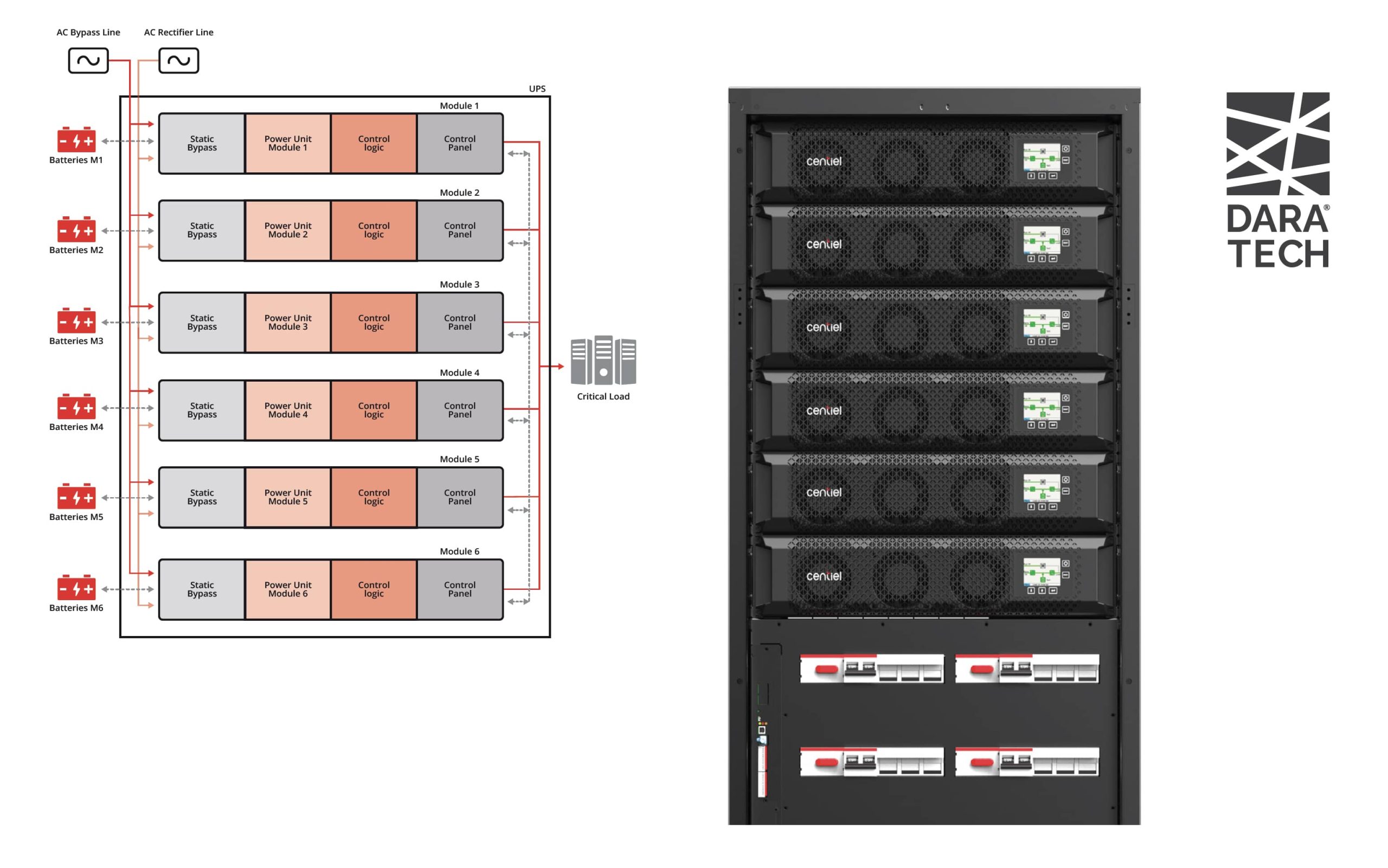 Centiel’s three-phase modular technology, referred to as Distributed Active Redundant Architecture (DARA), ensures 9-nines uptime availability with no single point of failure. With DARA, each UPS module is independent, redundant, and interconnected. Each module is a complete UPS system in its own right, with its own computing power, three independent power converters, a static bypass, and all the hardware devices needed to safely isolate a fault without impacting the load. This maximizes the mean time between failures (MTBF) and safeguards the power of your critical applications.