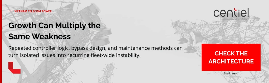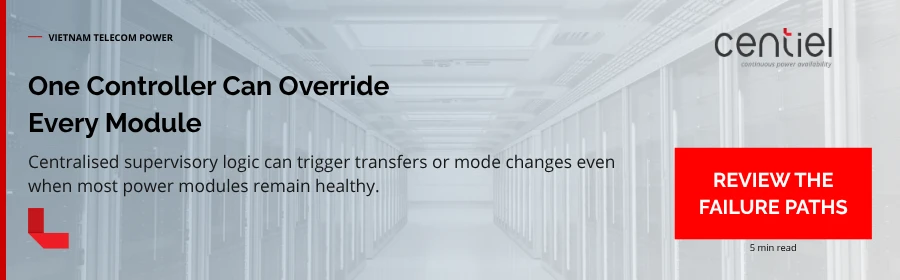 A: Centralised UPS control concentrates decision-making and often bypass functionality into a small number of components, so a single failure or misoperation can affect an entire facility or cluster of sites. As Vietnam’s telecom and data infrastructure grows, more traffic and revenue depend on each facility, and grid disturbances remain common, making any central chokepoint a disproportionate risk. Distributed architectures reduce this systemic exposure by localising faults and allowing degraded but continuous operation.