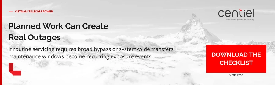 The operational moment is planned work that touches the whole system: a maintenance transfer that forces full-system bypass, or a controller-led state change affecting every load at once. Now the maintenance window owns you, because you’ve deliberately reduced conditioning for the entire site and increased the chance that a “normal” mains disturbance becomes a service incident.